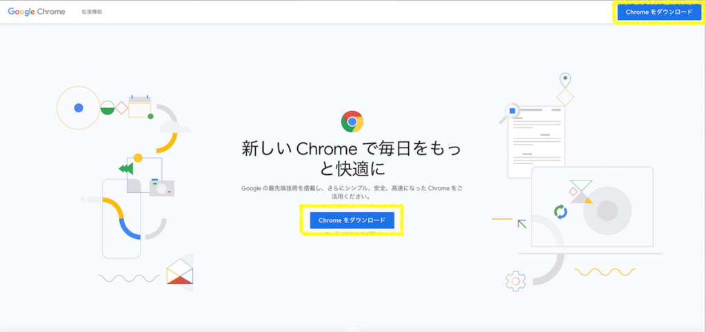 黄枠で囲った[Chromeをダウンロード]をクリックしましょう。