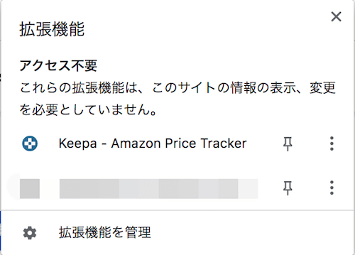 この中にKeepaが入っていれば拡張機能に追加できたということになります。ちなみにピンマークをオンにすると常時、拡張機能のアイコンが表示されるようになります。