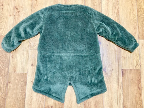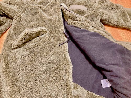 写真で伝わるか分かりませんが、イメージとしてはこたつ布団の中地のような質感だと思ってください。これがとにかく温かいし体に密着します。半纏のようなツルツルした質感ではないため、まさにこたつ布団を羽織っているように感じます。