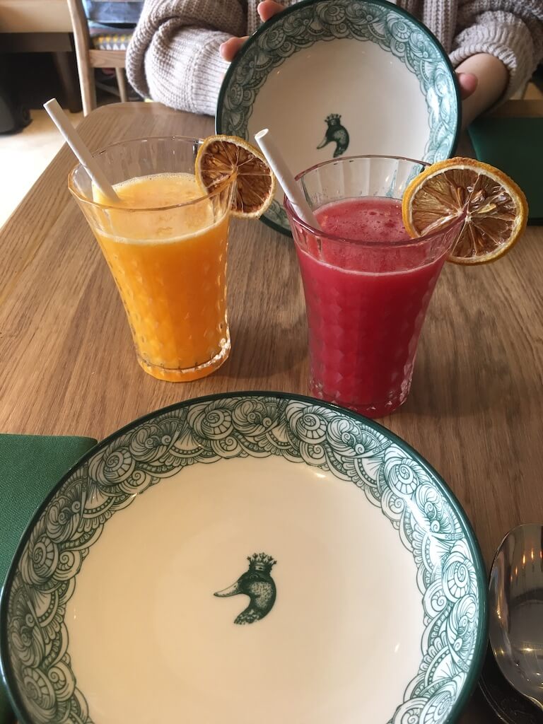 鴨の模様がついたお皿が可愛かったです!私はスイカジュース、友達はオレンジジュースをたのみました🥺