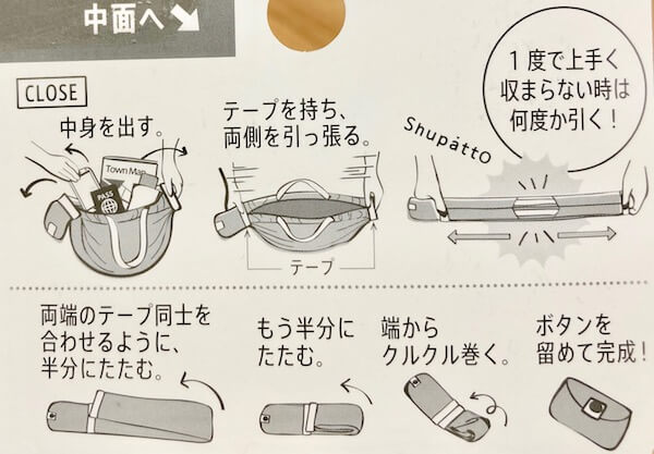 これがシュパッと(Shupatto)という製品名の由来でしょう。確かに簡単です。両端を引っ張るだけで元通りになるんですから。